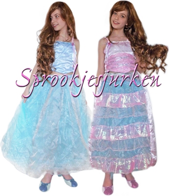 Dit is een omkeerbaar kostuum: de top kan binnenstebuiten gedragen worden, en de blauwe rok heeft een extra losse roze rok met laagjes, zo heb je 2 jurken inéén!